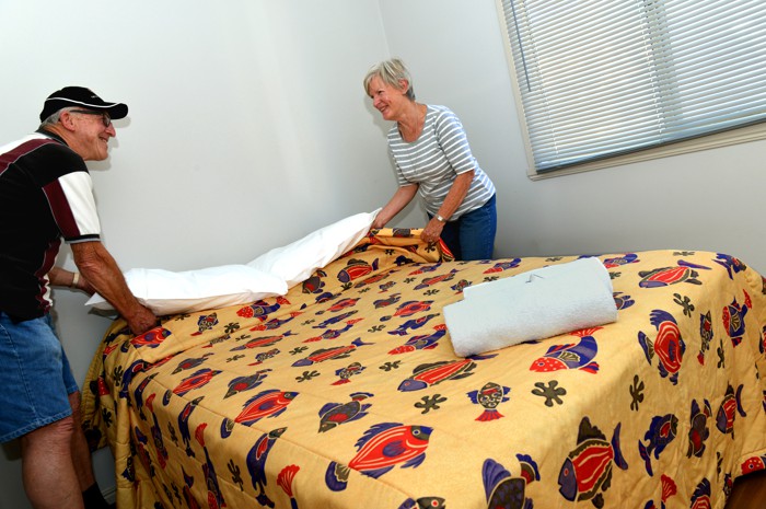 Containing a queen bed, (including linen). Fully self-contained kitchenette with microwave and full size fridge/freezer, (crockery and cutlery included). Also feature air-conditioning, ceiling fan, TV and separate bathroom (including towels).